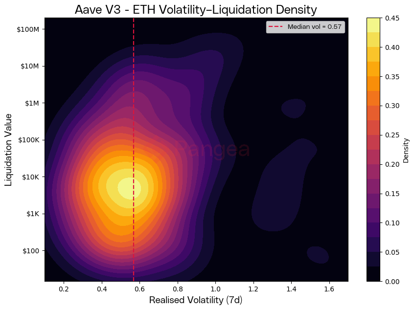 This suggests a bifurcation in liquidation dynamics: small retail-sized positions are steadily flushed out even under “normal” volatility regimes, while institutional or whale-scale liquidations cluster during stress events when realised volatility spikes above 0.8. In other words, routine market chop bleeds smaller players, but true volatility shocks are required to crack the largest positions, leading to multi-million-dollar cascades. The density ridge at sub-$10k liquidations around 0.4–0.6 volatility highlights this baseline churn, whereas the tail of the distribution confirms that systemic liquidation risk is disproportionately concentrated in the far-right tail of volatility.