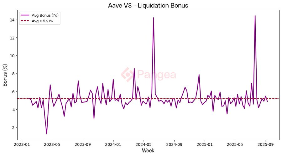The liquidation bonus — the extra margin liquidators earn on seized collateral — averages around 5.2%, with notable but infrequent spikes above 10% during periods of market stress. These spikes represent moments when liquidators were rewarded far beyond the baseline.
