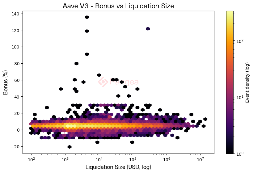 When viewed across liquidation sizes, the bonus appears relatively size-agnostic: most events cluster tightly around the 0–10% range regardless of notional value, from $100 liquidations up to multi-million-dollar ones. Extreme outliers with bonuses exceeding 50% are rare, suggesting that while the protocol can occasionally deliver windfall rewards, the liquidation mechanism is generally efficient and disciplined across scales.